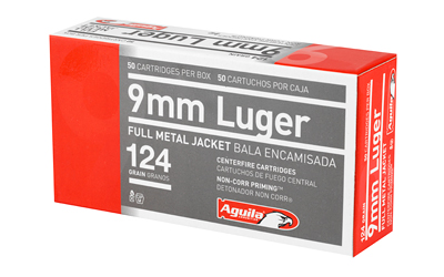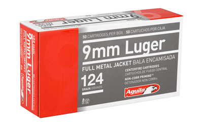 Aguila Ammunition 9mm Luger, 124 grain Full Metal Jacket is a brass-cased centerfire load intended for range use, training, and general practice. Each box contains 50 rounds and the product is listed as reloadable for users who handload spent cases. Published ballistic figures list a muzzle velocity of 1115 fps and muzzle energy of 342 ft-lbs. The cartridges are produced with a crimp at the case mouth to reduce the potential for projectile setback during handling and feeding.