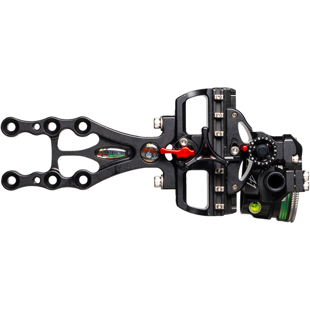 Single pin adjustable sight features Accu-Click system which allows the shooter to set “clicks” at desired distances. As the sight elevation is adjusted, it will stop at those specified distances. A 45 degree facing sight tape makes it easier for the shooter to see where the yardage indicator is set. 1st, 2nd, and 3rd axis adjustments can be made without the use of shims. Micro adjust windage is locked into place until the Windage Lock Button is disengaged. Includes Axcel AV-41 scope with .010” or .019” green fiber.