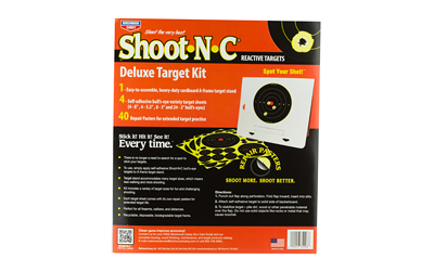 - The kit contains self-adhesive Shoot-N-C targets and 1″ pasters for extended use.