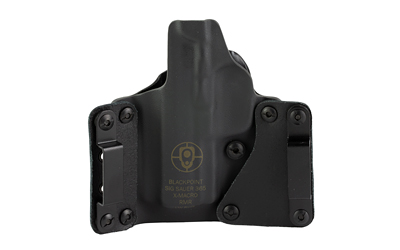 The Leather WING holster from BlackPoint Tactical is a hybrid leather-and-Kydex outside-waistband holster designed to fit the Sig P365 X-Macro. It retains the functional characteristics of a molded Kydex shell while adding leather wings to improve comfort and body contact. This right-hand, black OWB model integrates leather and Kydex so the holster offers consistent retention and a more comfortable wearing profile. It ships with 1.75" belt loops for secure attachment to a belt.