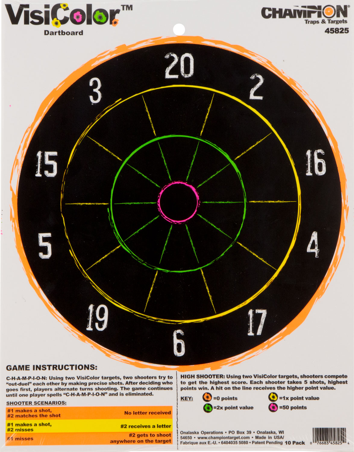 The Champion Targets VisiColor Dartboard is a hanging paper target designed to improve visibility and simplify scoring during range practice. Each sheet produces multi-colored impact halos that make shot placement easy to identify at a glance. These lightweight targets measure 11″x14″ and are supplied in a 10-pack for frequent use. Their paper construction keeps them economical and disposable for routine training sessions.
