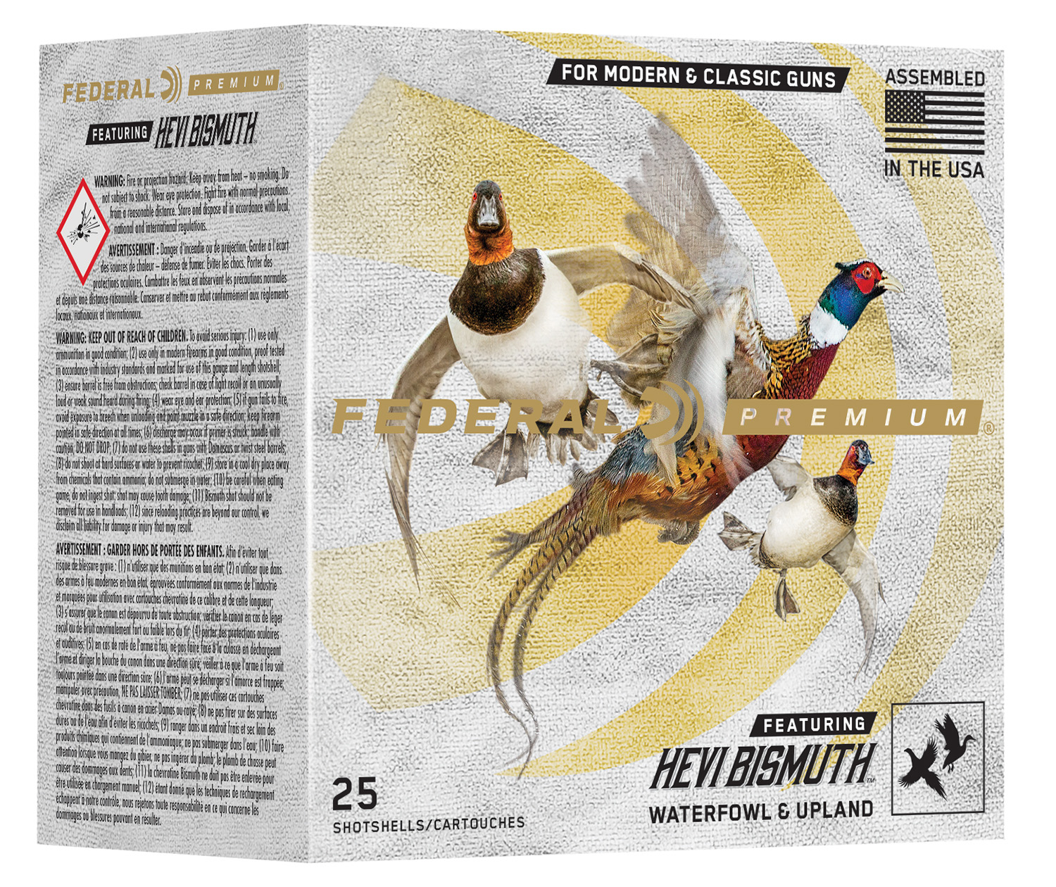 Federal HEVI-Bismuth shotshells pair high-density HEVI-Bismuth pellets with Federal Premium components for consistent ignition and patterning. These are 12 Gauge, 2.75 inch shells loaded with a 1 1/4 oz payload of #3 shot at a listed velocity of 1350 fps. The FLITECONTROL FLEX wad is used to promote dependable patterns across a range of modern and classic shotguns. Pellets are alloyed and cast in the USA.