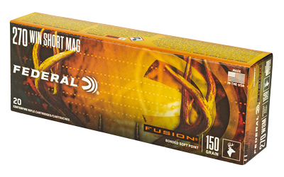 Federal Fusion rifle ammunition in .270 WSM is engineered for hunting applications, particularly medium-game such as deer. The cartridge is loaded with a 150-grain bonded jacketed soft point (Fusion) bullet and brass cases that are listed as reloadable. Manufacturer-listed performance includes a muzzle velocity of 3060 fps and a ballistic coefficient of 0.499. This load is packaged as 20 rounds per box with 10 boxes per case.