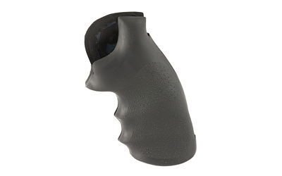 The Hogue Monogrip is a one-piece, overmolded rubber grip engineered to fit Ruger Redhawk revolvers. It combines a cobblestone textured surface and finger grooves to enhance purchase and control. The grip includes a Sorbothane insert positioned under the web of the hand to absorb recoil and improve comfort. Installation is tool-free; a patented steel stirrup clips over the existing stock pin or bottom strap for a secure fit without frame modification.