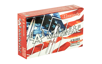 Hornady American Whitetail rifled slugs are intended for use in 12-gauge smooth-bore shotguns and designed for big-game hunting applications. Each projectile is a 1-ounce foster-style hollow point with a lead-alloy core, and the load is published at 1,600 feet per second. A compression-style wad is used to protect the slug at ignition and to help seal the bore for consistent velocity. Packaging is standard commercial boxes of 5 rounds with 20 boxes per case.