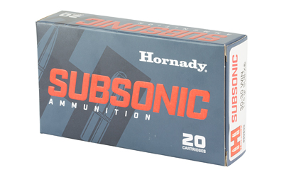 The Hornady Subsonic .30-30 Winchester load uses a 175‑grain Sub‑X bullet formulated for reliable performance at subsonic velocities. This load employs powders selected to provide consistency and a reduced muzzle flash. It is packaged in 20‑round boxes and is available in cases of 10 boxes (200 rounds). The listed muzzle velocity for this load is 1,050 feet per second.