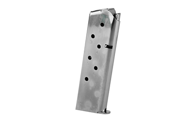 The Mec-Gar 7-round magazine is built for full-size 1911 pistols chambered in .45 ACP. It uses nickel-plated steel construction and heat-treated internal components designed for consistent feeding and durability. The magazine features a welded, flush-fit floorplate and is sized for the Colt Government/1911 full-size pattern.