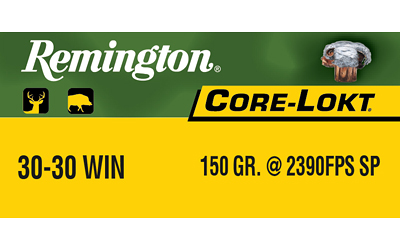 The Remington Core-Lokt .30-30 Winchester 150 grain soft point is a purpose-built centerfire rifle cartridge intended for medium-game hunting and traditional lever-action rifles. It features the Core-Lokt controlled-expansion bullet design with a tapered copper jacket locked to a solid lead core for reliable expansion and high weight retention. Cartridges are loaded in reloadable brass cases with non-corrosive primers and are supplied in 20-round boxes. Listed ballistic data include a published muzzle velocity of 2390 feet per second and a muzzle energy of 1902 foot-pounds.