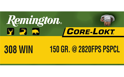 Remington Core-Lokt .308 Winchester 150 grain Pointed Soft Point (PSP) rifle ammunition supplied in 20-round boxes. The Core-Lokt bullet features a tapered jacket locked to a lead core to promote controlled expansion and weight retention. Cartridges are factory-loaded in brass cases with boxer primers and are listed as reloadable. Published performance for this loading indicates a muzzle velocity of 2820 fps and muzzle energy of 2648 ft-lbs.