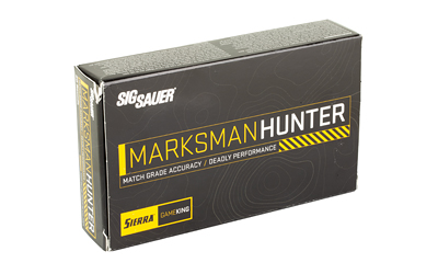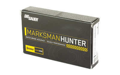 The Sig Sauer Marksman Hunter GameKing is a precision-loaded rifle cartridge developed for practical hunters and long-range shooting. It uses Sierra GameKing projectiles with a boat-tail profile to reduce drag and support a flatter trajectory. Each bullet features a robust jacket and a skived nose to promote consistent expansion on medium game. Ammunition is supplied in boxes of 20 rounds and in cases of 200 (10 boxes per case).