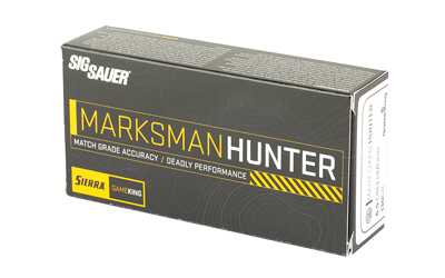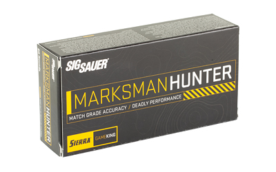The Sig Sauer Marksman Hunter ammunition is engineered for hunters and long-range shooters who require consistent, precision-loaded performance. These cartridges employ Sierra GameKing boat-tail projectiles to reduce drag and help maintain a flatter trajectory. Each 130-grain bullet features a thick jacket and a skived nose to promote controlled, consistent expansion on medium game. The product is packaged in 20-round boxes for field-ready convenience.