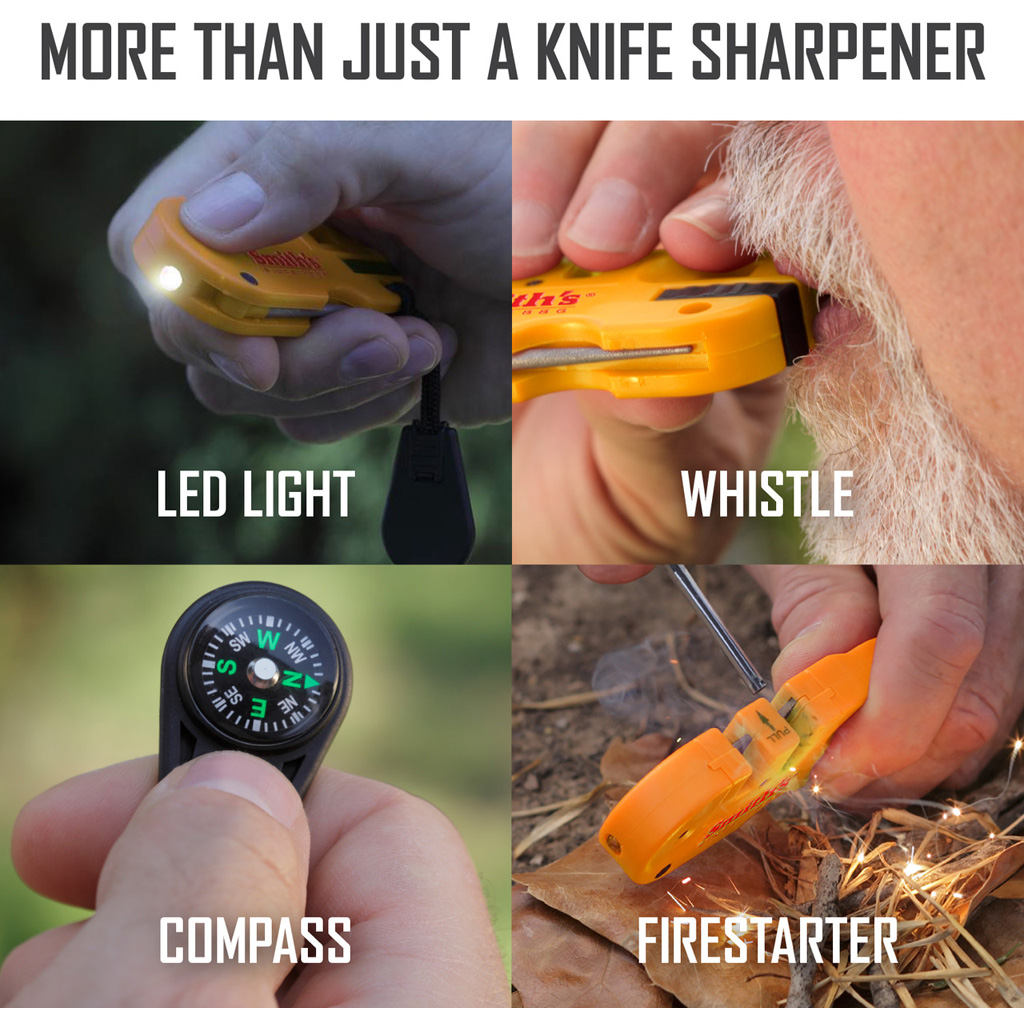 The Pocket Pal X2 Sharpener and Outdoors Tool combines knife maintenance and essential outdoor functions in a compact, portable design. Coarse carbide and fine ceramic pull-through slots restore and refine edges, while a fold-out tapered diamond rod sharpens serrations, gut hooks, and single-bevel blades. Integrated survival features include a fire starter, compass, LED light, and signal whistle for added utility in the field. Preset sharpening angles ensure consistent results, and the lightweight housing is built for durability and easy carry. The tapered rod stores securely within the handle.