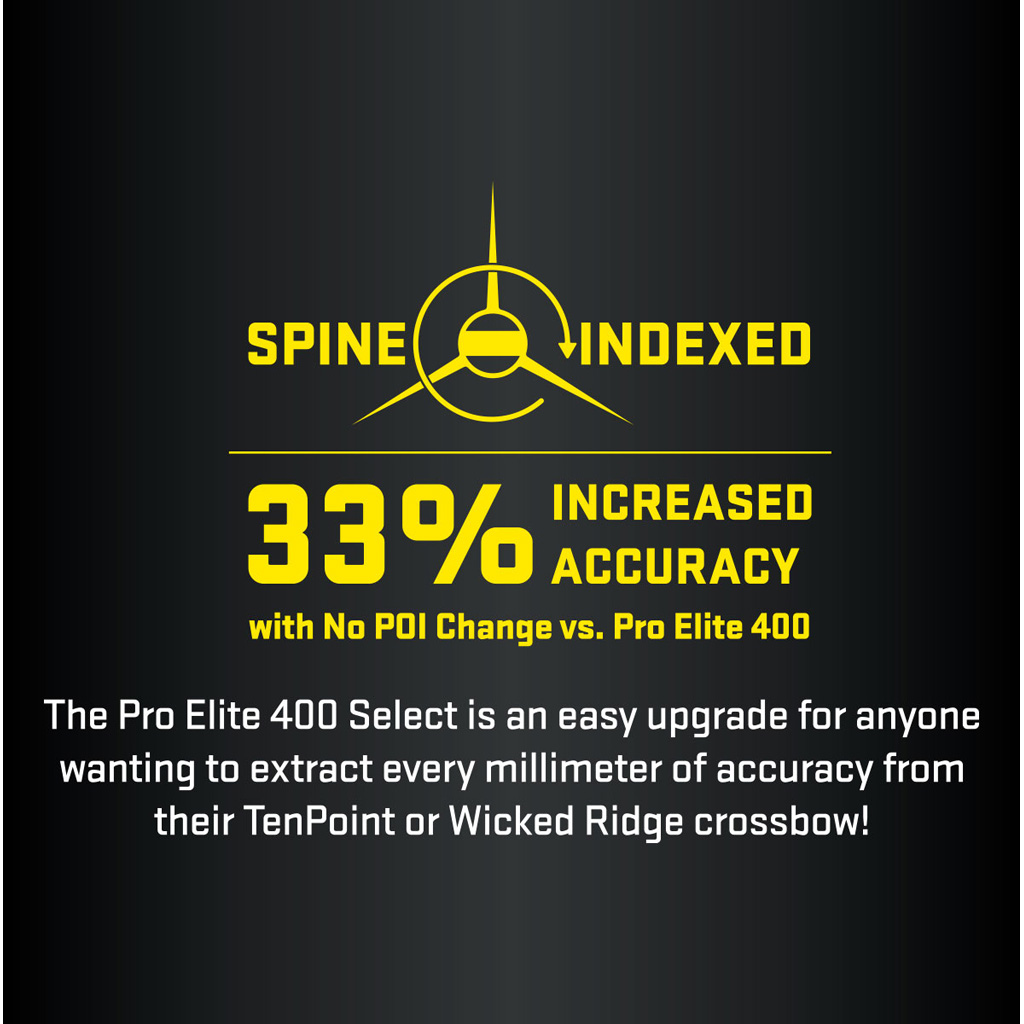 The Pro Elite 400 Select is a 20-inch crossbow arrow weighing 410 grains and built with a precision spine-indexed carbon shaft to deliver consistent downrange accuracy. It uses a 3-inch Q2i Fusion X-II vane fletching, a 58-grain aluminum insert, and a 13 percent FOC. Each arrow is fitted with an Alpha-Nock HP and an HP aluminum bushing for added strength and repeatable nock travel. Arrows are inspected to 0.001-inch straightness and weight matched within 1 grain per arrow.