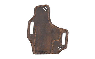 The Versacarry Guardian Arc Angel is an outside-the-waistband (OWB) leather holster sized for sub-compact autos and configured for right-hand carry. It uses a double-ply raised backing and Flex Vent technology to speed break-in while protecting the body from contact. The design includes a forward cant for ergonomic positioning and is optics compatible for many compact setups. Constructed from vegetable-tanned water buffalo leather with distressed finish details, the holster blends traditional materials with practical carry features.