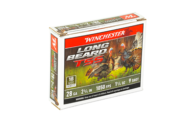 The Winchester Long Beard TSS 28 Gauge 2.75-inch shotshell is a sub-gauge load developed for turkey hunting where high shot density and retained energy matter. Each 2.75-inch shell contains a 1-1/4 ounce payload of #9 TSS configured at 18 g/cc to increase downrange performance and pattern consistency. The buffered payload is designed to promote smooth shot flow through chokes and reduce flyers for more uniform patterns. Packaged in 5-round boxes with 10 boxes per case, this load is sized for field use and convenient handling.