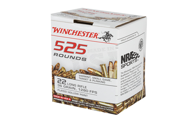 Winchester USA White Box .22 Long Rifle is offered in a bulk 525-round pack designed to deliver consistent performance for general shooting purposes. This offering is listed with a 36-grain bullet and manufacturer materials include published ballistics for a muzzle velocity of 1280 fps and muzzle energy of 131 ft-lbs. Packaging is oriented toward bulk use, with the availability of a 10-box case totaling 5,250 rounds in case configuration.