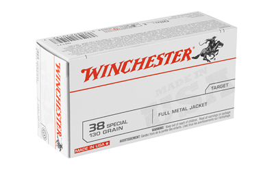 Winchester USA White Box .38 Special 130-grain Full Metal Jacket ammunition is a straightforward, value-oriented option for target shooting and range practice. These are centerfire cartridges loaded to a listed muzzle velocity of 800 fps and muzzle energy of 185 ft-lbs. Each factory-sealed box contains 50 rounds; case pack quantities are shown as 10 boxes per case in source data. The cartridges use brass cases and are noted as reloadable.